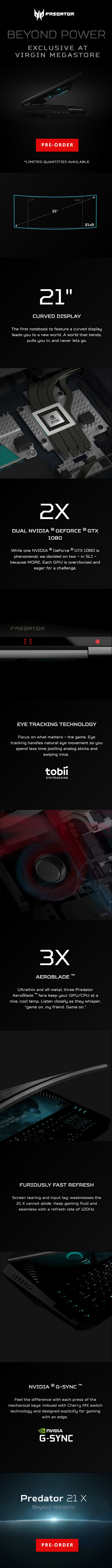The Predator 21 X features the latest 7th Generation Intel® Core™ i7 processor, 5 cooling fans and dual NVIDIA® GeForce® GTX 1080 GPUs in SLI for unmatched graphics performance. Making each Predator 21 X unique, Acer lets customers add a design, flag and laser engraved name to the notebook’s maintenance panel.